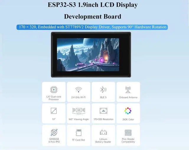 ESP32-S3 with 1.9inch Touch LCD Display Development Board 170 x 320, 262K Color, 32-bit LX7 Dual-Core Processor, Up to 240MHz Frequency, Supports 90° Hardware Rotation