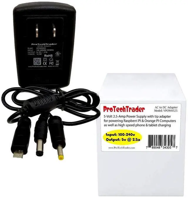 5 volt 2500ma AC DC Power Supply with SBC Adapter Kit - Comes with standard 5.5 mm x 2.5 mm tip and both Orange Pi and Raspberry PI converters Raspberry Pi Micro USB and Orange Pi 4.0 mm x 1.7 mm adapters are included in this Single Board Computer Powering Solution 2.5 amps of current allows you to fully power your PC without slowing down your processor speed to compensate for low power cheap adapters Versatile DC Barrel Connector Converters Adapts the standard 5.5 x 2.5 mm barrel connector to MicroUSB or 4.0 x 1.7 mm MicroUSB Adapter with 5v 2.5A Output allows Fast Charging of 1000s of Smartphones, Tablets, Portable Battery Chargers and More all with this Certified UL Listed & ROHS Compliant plug 5V 2.5A Raspberry Pi & Orange Pi Power Supply with SBC Adapter Kit comes with a standard 5.5 x 2.5 mm DC power Supply Tip with bot Raspberry PI (Micro USB) and Orange PI ( 4.0 x 1.7 mm) barrel connector Converter Tips Single Board Computer (SBC) Kit adapters included not only work for the RPI and OPI SBCs but 1000 of other devices using any of the included tip sizes.