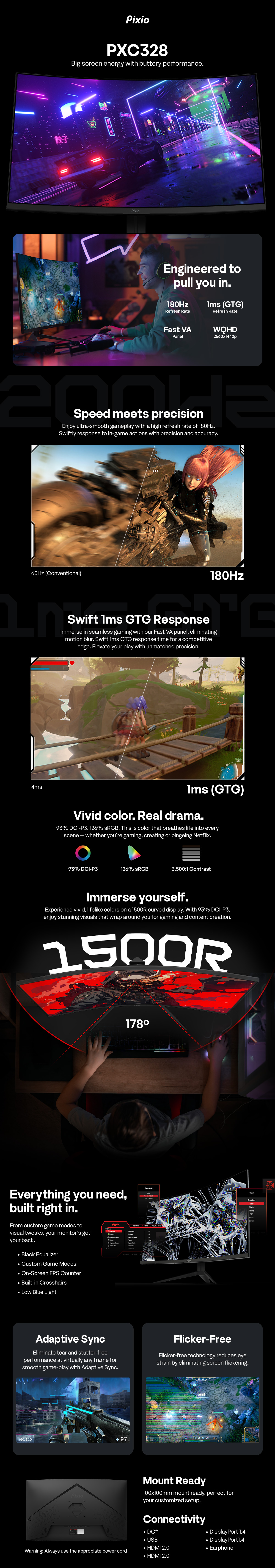 Pixio PXC328 32 inch 180Hz Refresh Rate QHD 1440p Resolution 1500R Curved Fast VA Panel 1ms GTG Response Time Adaptive Sync HDR Curved Gaming Monitor