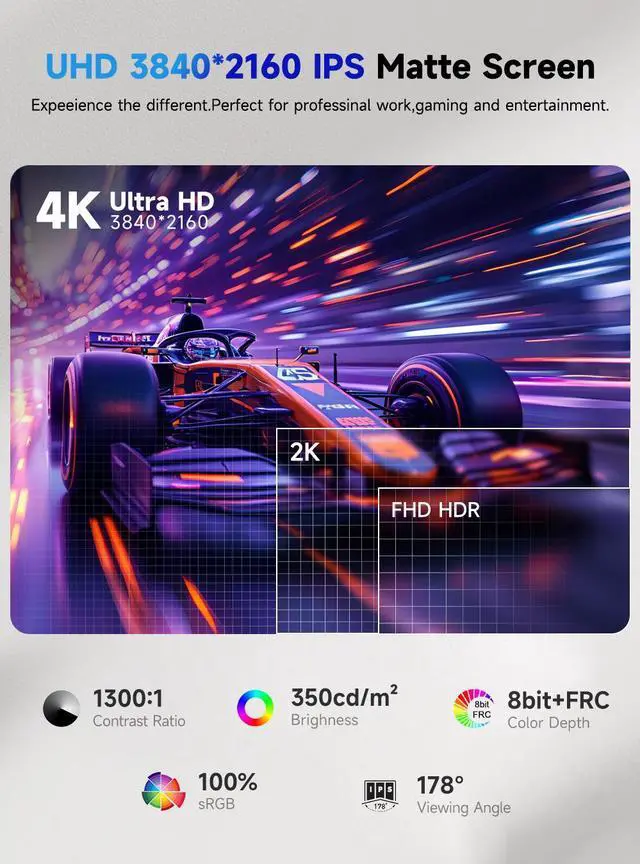 Vivid 4K Visuals:With 4K UHD 3840*2160 resolution and a 60Hz refresh rate, combined with 100% sRGB color accuracy, enjoy crystal - clear images, smooth motion, and true - to - life colors.