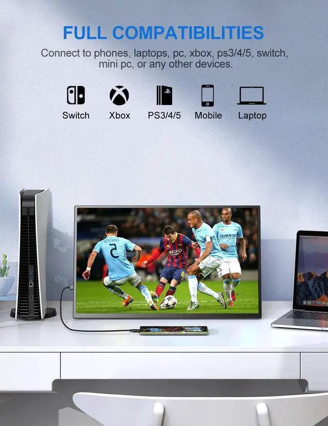 Wide CompatibilitiesEquipped with a mini HDMI port, and 2*USB C 3.1 ports, you could connect to a laptop, PC, Phone, Raspberry Pi, XBOX, PS3, PS4, Wii, and Switch.