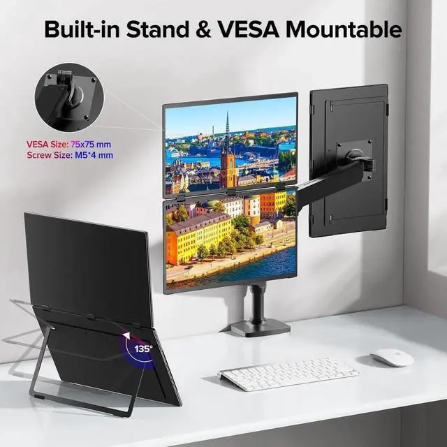 VESA (75x75 mm) support allows for wall mounting or integration with monitor arms. Ideal for extending your laptop screen, gaming on-the-go, or sharing content during presentations.