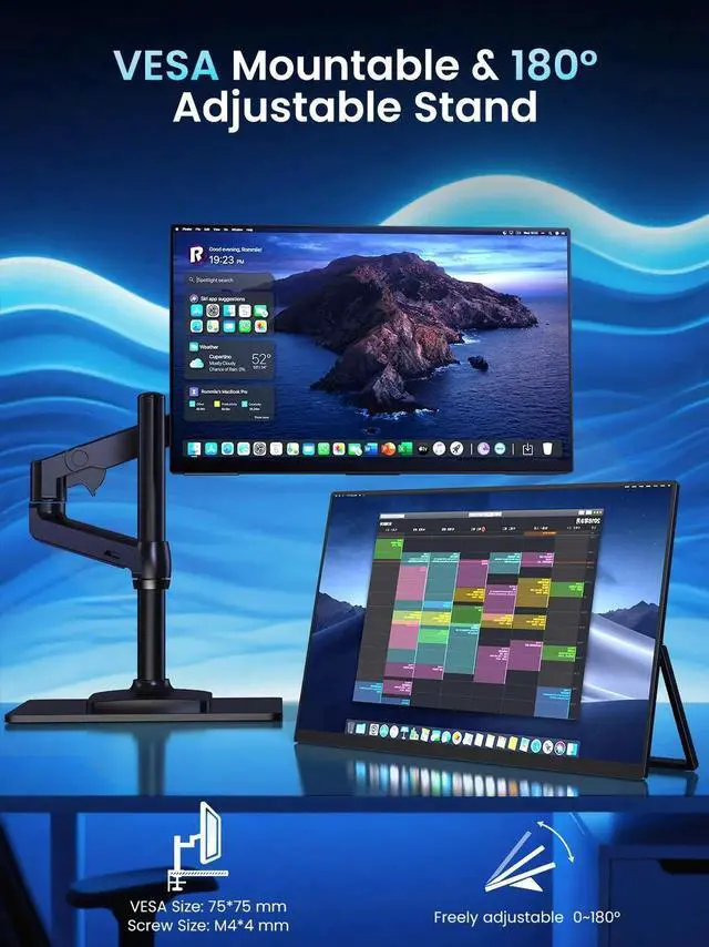 Versatile Setup Options: Use the built-in 180° adjustable kickstand for ergonomic viewing or mount it anywhere with VESA 75x75mm compatibility (bracket not included). Sets up in seconds via USB-C or HDMI.