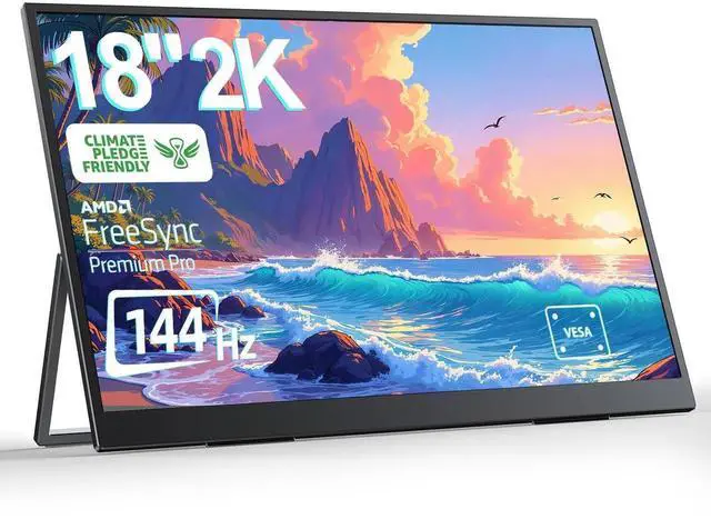 Ultimate Portable Monitor with Stand: Enhance your gaming and work setup with this 18" portable monitor featuring sharp 2K resolution and a fast 144Hz refresh rate, complete with a convenient stand for easy adjustment.