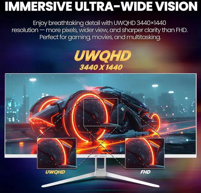 Upgrade your setup with the CRUA 34" White Ultrawide Gaming Monitor, a stylish centerpiece that combines performance, immersion, and productivity in one display. Featuring a 21:9 WQHD 3440×1440 IPS panel, it offers the screen space of a dual-monitor setup without bezels in the middle, giving you more room for timelines, spreadsheets, chats, and tools on a single, seamless screen.