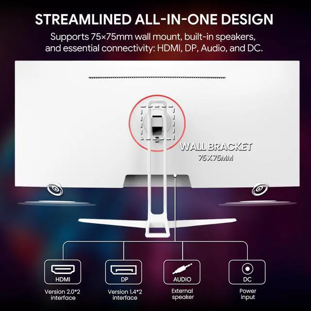 For connectivity and convenience, the monitor includes two HDMI 2.0 ports, one DP 1.4 port, and a 3.5mm audio jack, plus built-in speakers for instant sound out of the box. The adjustable tilt stand and 75×75mm VESA mount compatibility give you flexible installation options, whether you want a clean, minimalist desk or a fully mounted battlestation. Sleek and modern, this 34" white ultrawide is ideal for white-themed gaming rooms, creative studios, home offices, and dorm setups where style and performance matter equally.