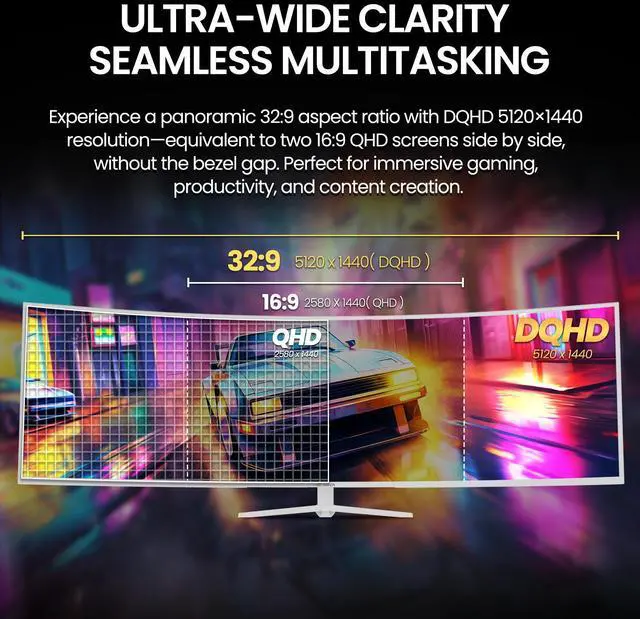 Experience truly immersive visuals with the CRUA 49-inch curved monitor, featuring an ultra-wide 32:9 aspect ratio and stunning DQHD 5120×1440 resolutionequivalent to two 27-inch QHD screens seamlessly combined, without bezel gaps. The 1500R curvature wraps your field of view, creating a more natural, comfortable viewing experience whether youre deep in a project, watching movies, or locked into an intense gaming session.