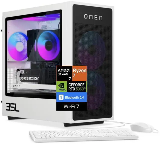 Model: HP OMEN 35LForm/Style: TowerProcessor: Zen 4 Gen Ryzen 7 8700F 4.1GHz Processor (upto 5 GHz, 16MB Cache, 8-Cores, 16-Threads, )Memory: 64GB DDR5 DIMMGraphics: GeForce RTX 5060 Ti 16GB GDDR7 Dedicated Graphics, VR Ready Storage: 1TB PCIe SSD (Solid State Drive) + 2TB HDD (Hard Disk Drive)Operating System: Windows 11 Home-64Display: Connectivity: 802.11be, Bluetooth 5.4, RJ-45Ports/Slots:, 4 USB 2.0, HDMI, 3 Display Port, 2 USB 3.2 Type-C, 1 x Headphone/Microphone Combo JackInput/Output:, White, USB Keyboard, USB Mouse, Battery: 500W PSU, Other Features RGB Lighting, Color: Panda MetalWeight: 27.5lbProduct Dimensions (WxLxH): 16.75 IN x 16.75 IN x 8.4 IN1 Year Manufacturer warranty from Velztorm (Professionally upgraded by Velztorm)