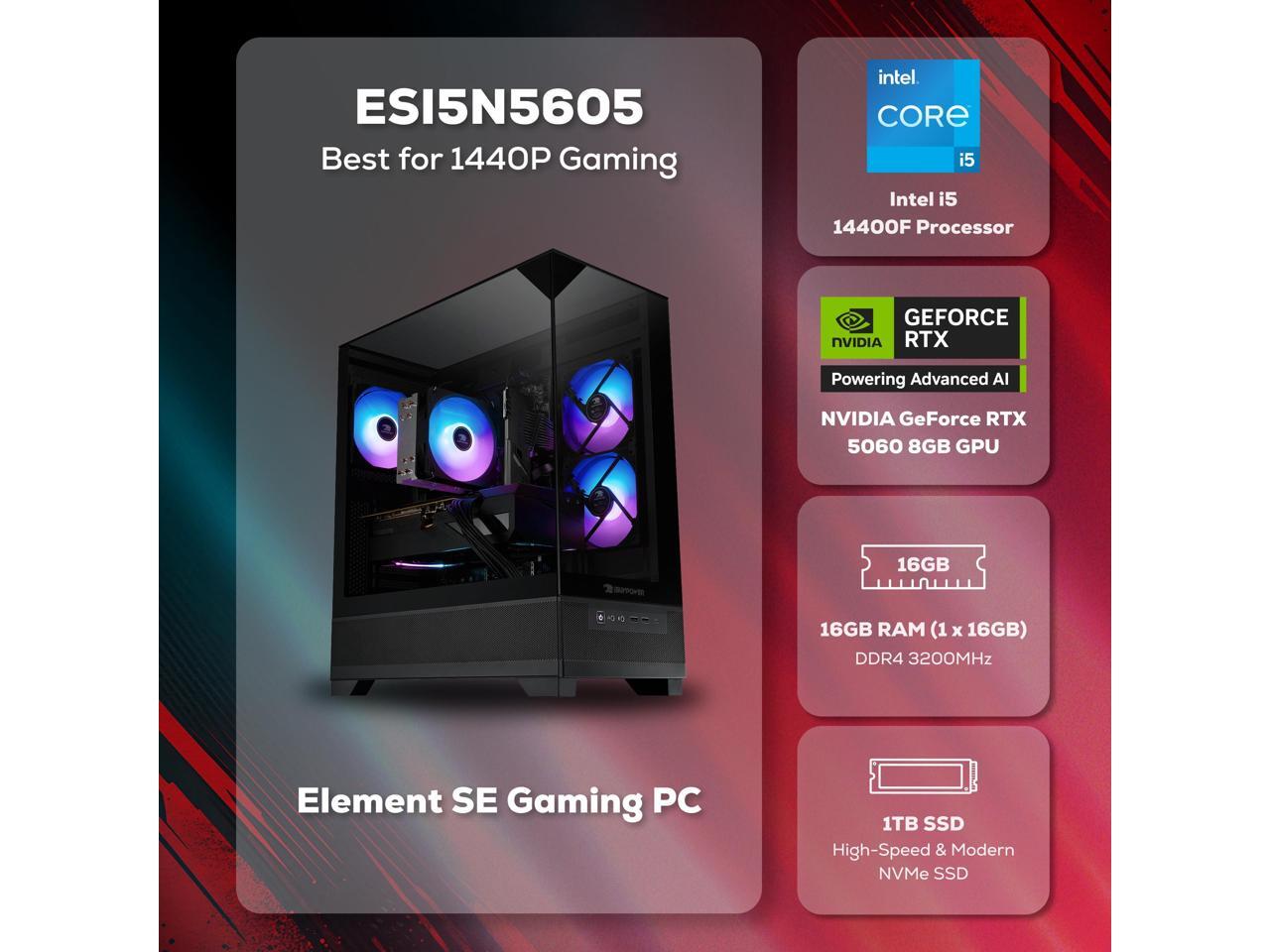 iBUYPOWER Element SE Gaming PC Desktop Computer Intel Core i5 14400F CPU, NVIDIA GeForce RTX 5060 8GB GPU, 16GB DDR4 Non-RGB RAM, 1TB NVMe SSD, Windows 11 Home, Keyboard, Mouse - Black