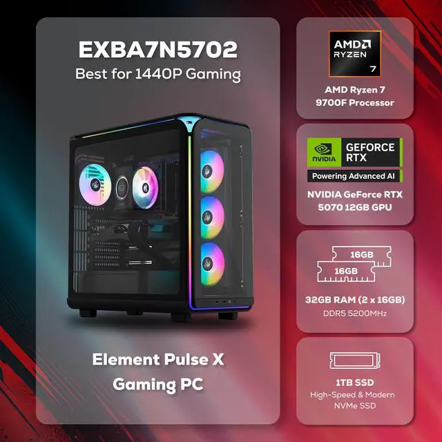 This prebuilt iBUYPOWER Gaming PC utilizes professionally vetted components to create a high-performing desktop machine. Take gaming and content creation to a new level on an AMD Ryzen 7 9700F processor paired with an NVIDIA GeForce RTX 5070 12GB graphics card. Enjoy fast load times and ample storage space on a 1TB NVMe solid-state drive. Multitask like no other thanks to 32GB DDR5 RAM. The PC is even Wi-Fi Ready and comes with Windows 11 Home installed so you can plug in and game right away.