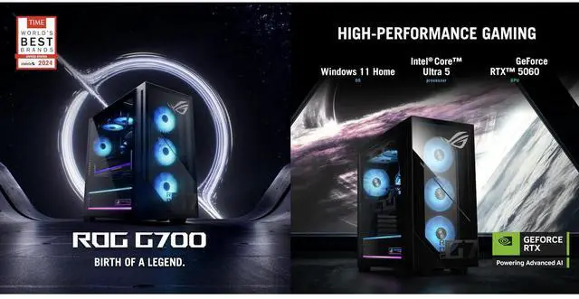 Model: ASUS ROG G700Form/Style: TowerModel No: G700TF-U5F5060Processor: 15th Gen Ultra 5 225F 3.30GHz Processor (upto 4.9 GHz, 20MB Cache, 10-Cores, 10-Threads, 6 Performance-cores)Memory: 16GB DDR5 DIMMGraphics: NVIDIA GeForce RTX 5060 8GB GDDR7 Dedicated Graphics, VR Ready Storage: 1TB PCIe SSD (Solid State Drive)Operating System: Windows 11 Home-64Display: Connectivity: 802.11ax Wifi, Bluetooth 5.4, RJ-45Ports/Slots:, 4 USB 2.0, HDMI, 3 Display Port, 2 USB 3.2 Type-C, 1 x Microphone Jack, 1 x Headphone JackInput/Output:, Black, RGB KB USB Keyboard, USB Mouse, Battery: 600W PSU, Other Features, Color: BlackWeight: 31.5lbProduct Dimensions (WxLxH): 20 IN x 20.5 IN x 9.50 IN