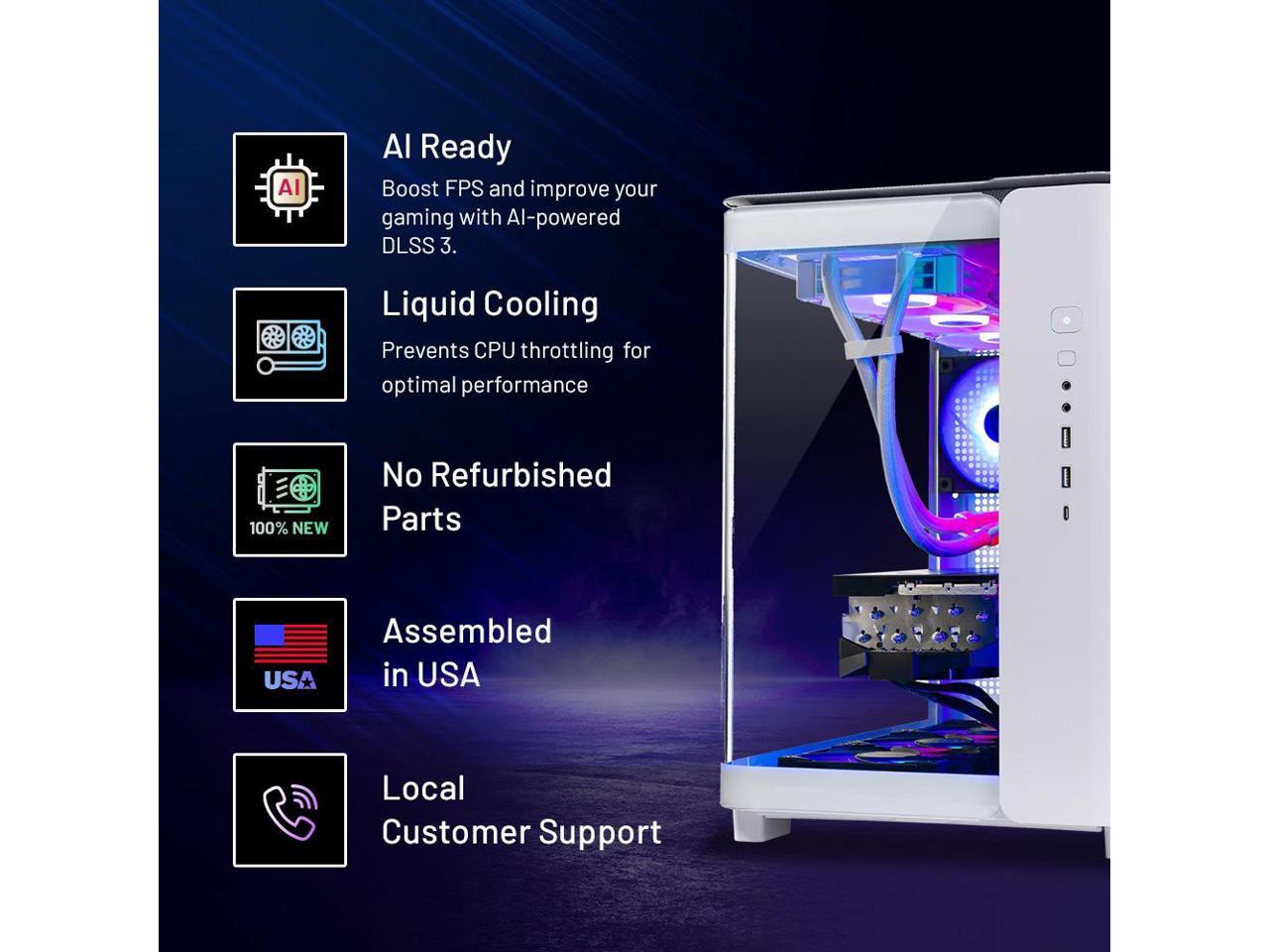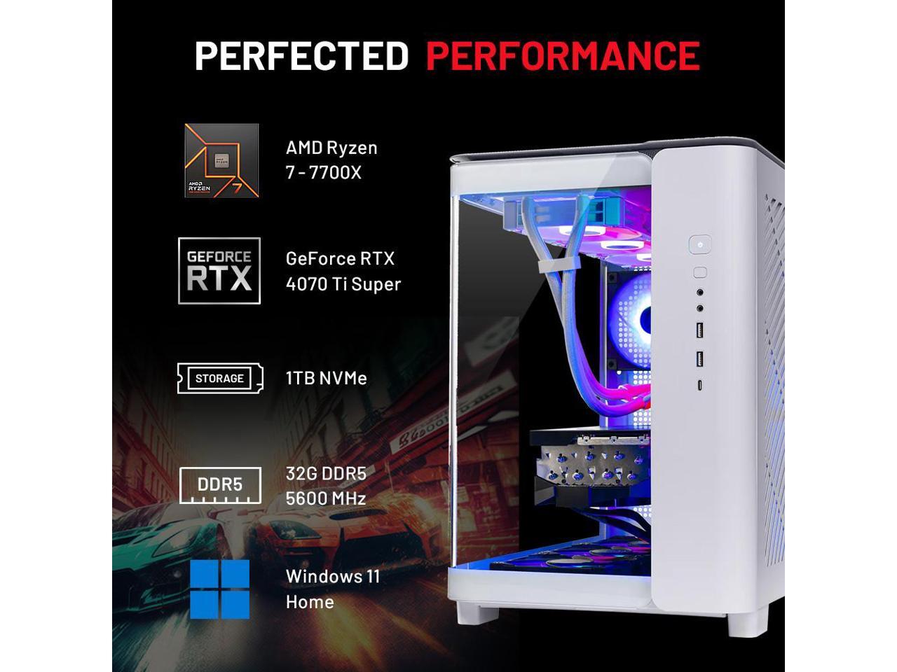 - AMD Ryzen 7 7700X 4.5GHz (5.4GHz Turbo Boost) CPU Processor | 1TB Gen4 NVMe M.2 SSD Up to 30x Faster Than Traditional HDD | 360mm AIO Liquid CPU Cooler with ARGB Fans, say goodbye to outdated and inefficient air coolers. NVIDIA Geforce RTX 4070 Ti Super 16GB GDDR6X Graphics Card (Brand may vary) | 32GB DDR5 RAM 5600 RGB Gaming Memory with Heat Spreader | Windows 11 Home 64-bit 802.11 AC | No Bloatware | Graphic output options include 1 x HDMI, and 1 x Display Port Guaranteed, Additional Ports may vary | USB Ports Including 2.0, 3.0, and 3.2 Gen1 Ports | HD Audio and Mic | Free Gaming Keyboard and Mouse |High-spec AIO liquid coolers used, delivering unmatched cooling performance for a perfect operational experience and unparalleled cooling performance. With hardware unrestricted by temperature limits, you can unleash its full potential. Whether gaming, creating, or working, you'll never suffer from thermal throttling again.