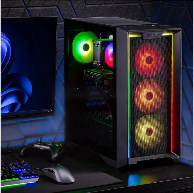 AMD Ryzen 5 5500 3.6GHz (4.2GHz Turbo Boost) CPU Processor | 500GB NVMe M.2 SSD Up to 30x Faster Than Traditional HDD | High-Performance Air Cooler NVIDIA Geforce RTX 3050 6GB GDDR6 Graphics Card (Brand may vary) | 16GB DDR4 RAM 3200 Gaming Memory with Heat Spreader | Windows 11 Home 64-bit| 802.11 AC | No Bloatware | Graphic output options include 1 x HDMI, and 1 x Display Port Guaranteed, Additional Ports may vary | USB Ports Including 2.0, 3.0, and 3.2 Gen1 Ports | HD Audio and Mic | Free Gaming Keyboard and Mouse High-Performance Air Cooler: Maximum Airflow & ARGB Fans | Skytech Nebula Black Edition with Front Mesh | 1 Year Warranty on Parts and Labor | Lifetime Free Technical Support | Assembled in the USA