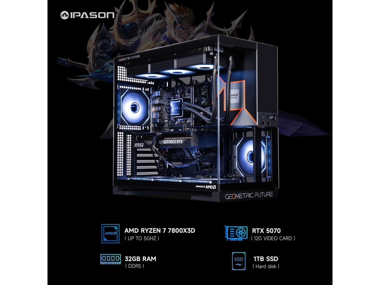IPASON Ryvex Gaming Desktop, Ryzen 7 7800X3D, NVIDIA RTX5070 12GB,32GB DDR5 RAM, 1TB M.2 NVMe,Windows 11 home,WIFI,360MM Liquid Cooler, ARGB Fans, AI Ready,850W Gold PSU, Prebuilt Gaming Pc