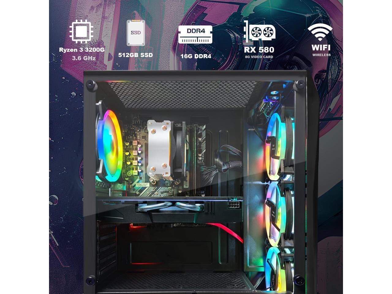 - PC Gaming System: This gaming computer desktop is loaded with AMD Ryzen 3 3200G 3.6 up to 4GHz | 16GB DDR4 Memory | 512GB Solid State Drive | Genuine Windows 11 Home 64-bit