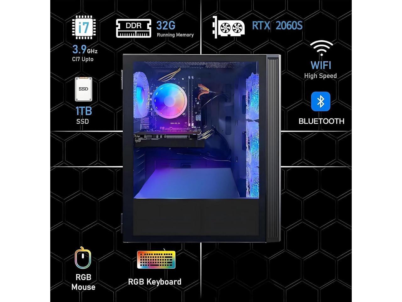 STGAubron Gaming PC Computer Desktop, Intel Core i7 up to 3.9G, GeForce RTX 2060 Super 8G, 32G RAM, 1TB SSD, WiFi 6, BT 5.0, RGB Fan x 4, Windows 11 Home