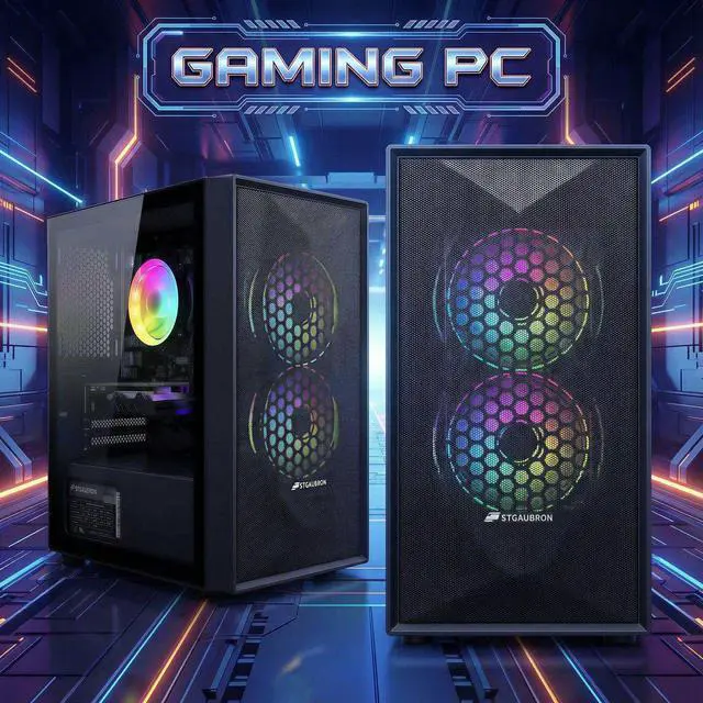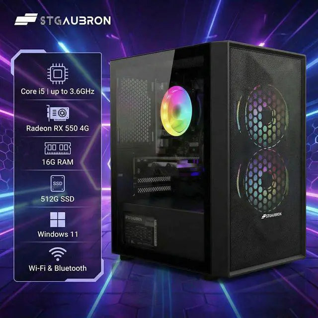 The STGAubron Prebuilt Gaming PC Desktop delivers reliable performance for gaming and everyday computing. Powered by an Intel Core i5 processor with speeds up to 3.6GHz, this system ensures smooth multitasking and responsive gameplay. The integrated Radeon RX 550 4GB graphics card provides solid visual performance for popular games and multimedia tasks. With 16GB of RAM and a 512GB SSD, users benefit from fast load times, ample storage, and efficient application management. Connectivity is enhanced with WiFi 6 and Bluetooth 5.0, supporting high-speed wireless networking and peripheral pairing. The inclusion of two RGB fans not only improves cooling but also adds a customizable aesthetic. Pre-installed with Windows 11 Home, this desktop is ready for use out of the box.