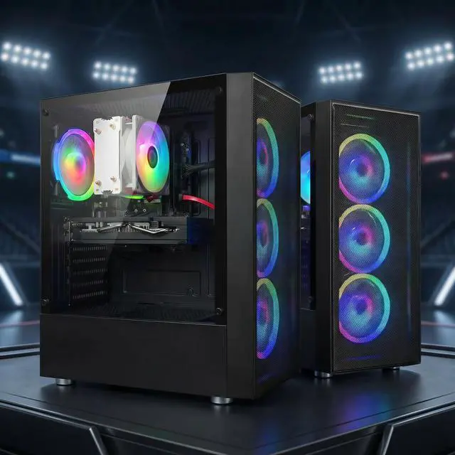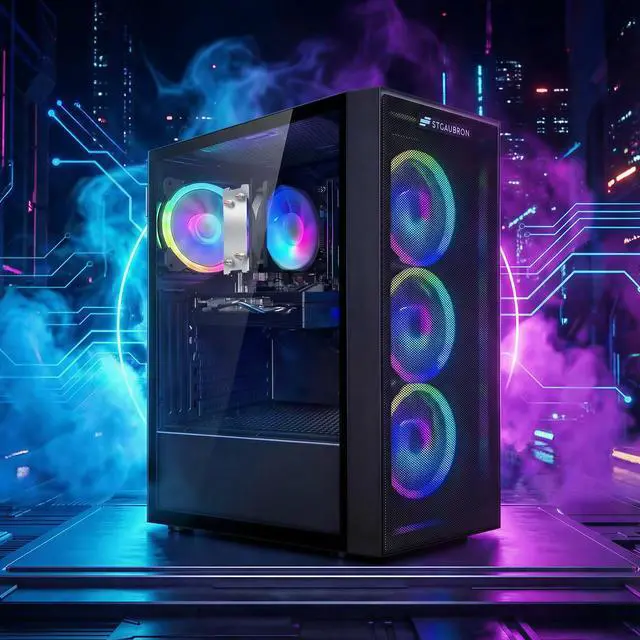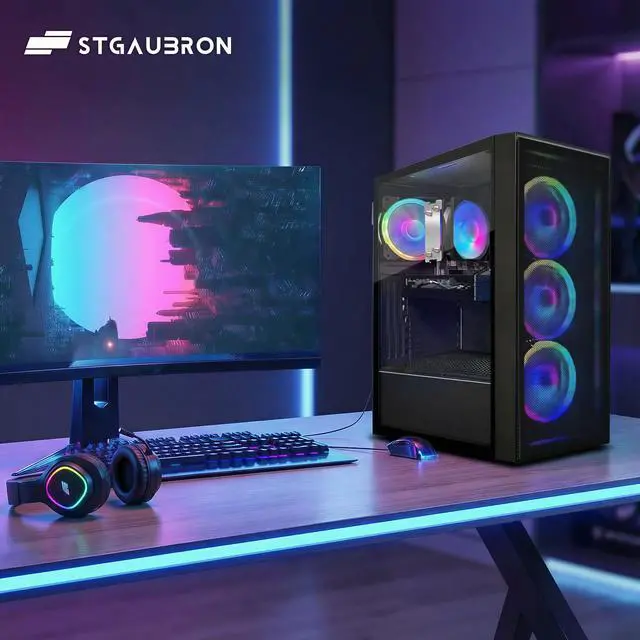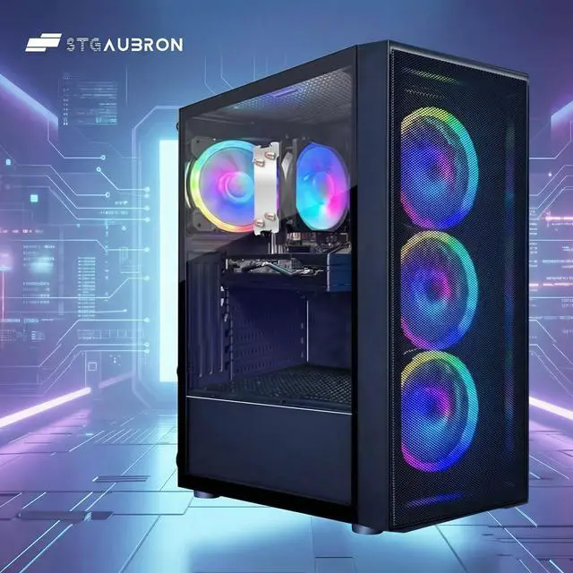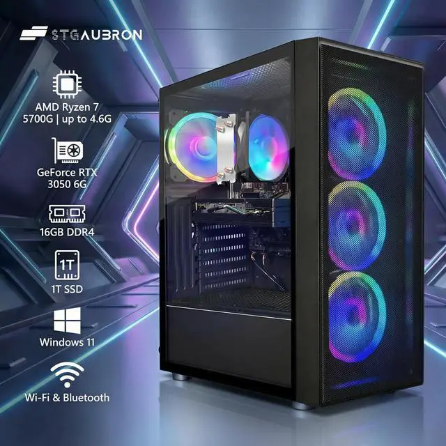 The STGAubron Gaming PC Desktop Computer is engineered for high-performance gaming and demanding applications. Powered by the advanced AMD Ryzen 7 5700G processor, reaching speeds up to 4.6GHz, this system ensures smooth multitasking and efficient processing. The GeForce RTX 3050 6GB graphics card delivers immersive visuals and supports modern gaming titles with superior frame rates. Equipped with 16GB DDR4 memory and a spacious 1TB SSD, users benefit from rapid load times and ample storage capacity. Enhanced connectivity is provided via WiFi 6 and Bluetooth 5.2, ensuring fast, reliable wireless performance. Four integrated RGB fans offer effective cooling alongside customizable lighting effects. Pre-installed with Windows 11 Home, this desktop is ready for immediate use, making it an ideal choice for gamers and power users seeking reliability and style.