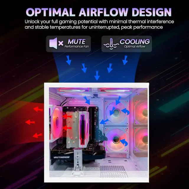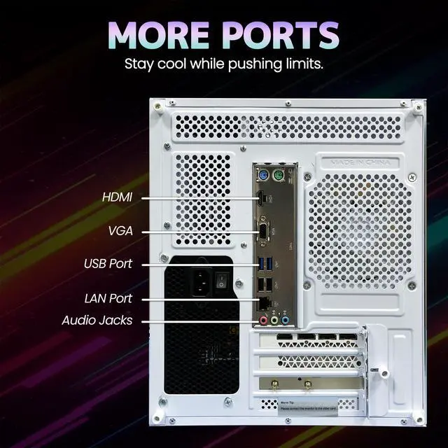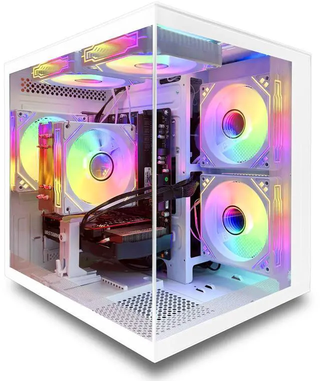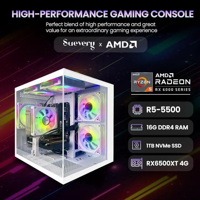 The Suevery V900 White Gaming PC desktop delivers a focused gaming experience. Powered by the 6-core AMD Ryzen 5 5500 processor and the AMD Radeon RX 6500 XT graphics card with 4GB dedicated memory, this setup is built to handle today's popular games at smooth frame rates. Jump into action quickly with the speedy 1TB NVMe SSD, supported by 16GB of high-speed DDR4 RAM for excellent responsiveness and multitasking. Housed in a clean white chassis, this system balances performance, aesthetics, and cost-effectiveness for gamers seeking a solid, ready-to-run desktop.