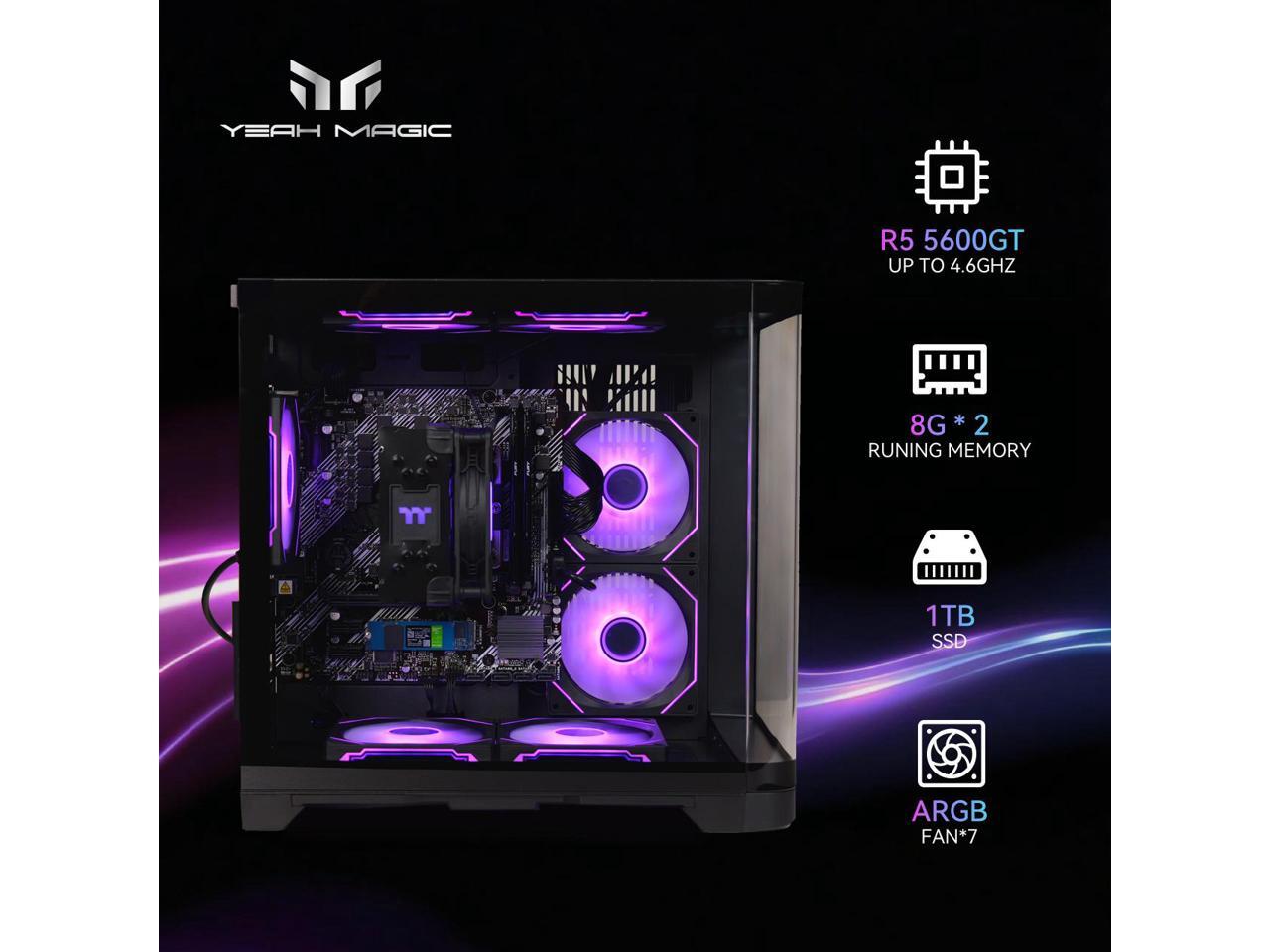 YEAH MAGIC Astral S1 Gaming Desktop AMD Ryzen 5 5600GT 3.9GHz 16GB(8G*2) DDR4 3200 1T NVME SSD ARGB 7 Fans Win 11 Home Gamer Desktop Computer Office Work WIFI 6 650W Gold PSU Black