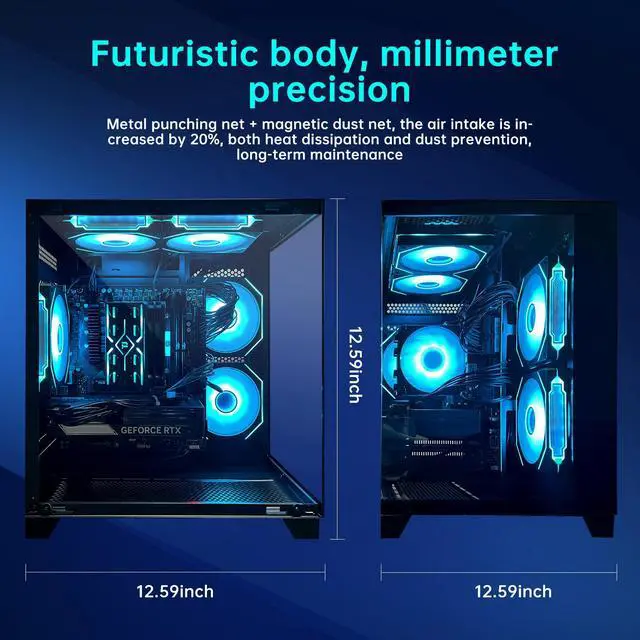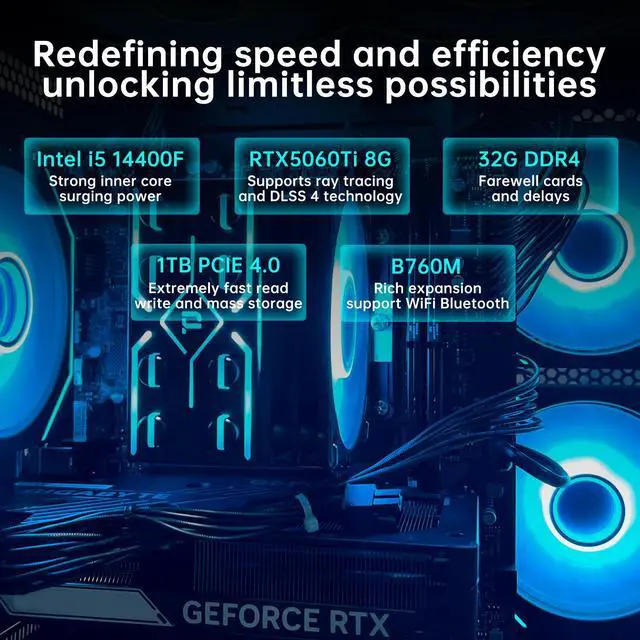 The AOACE gaming desktop features a 2.5GHz Intel Core i5-14400F processor paired with an NVIDIA RTX 5060 Ti graphics card (8GB GDDR7 VRAM) supporting DLSS 4 technology, delivering an immersive gaming experience. A 1TB NVMe SSD enables lightning-fast data read/write speeds, while 32GB DDR4 3200MHz memory ensures smooth performance. Its distinctive Aquarium-style design is not only visually stunning but also an exceptional way to enjoy gaming. This unique aesthetic delivers outstanding thermal performance. Equipped with wireless Wi-Fi 6E and Bluetooth 5.3 technology, it enables effortless connectivity.