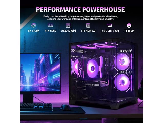AOACE Gaming PC Desktop AMD Ryzen 7 5700X,RTX 5060 8G 16GB RAM and 1TB NVMe M.2 SSD, WiFi6E, ARGB Fan, Game Design Office console,Sea View Room Windows 11