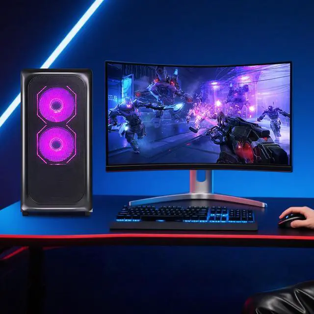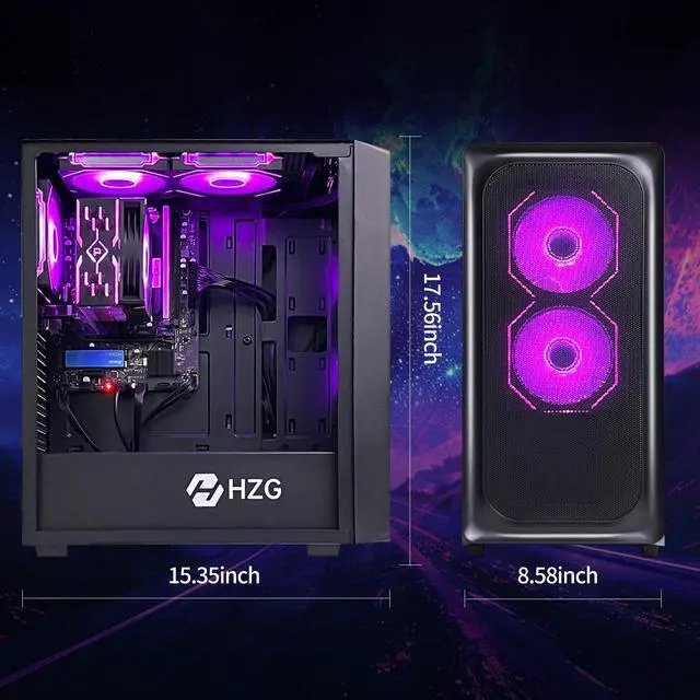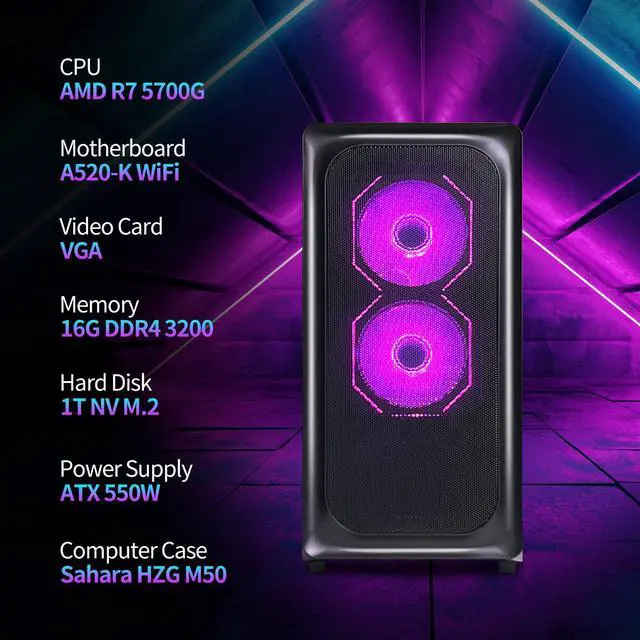 Equipped with AMD Radeon Vega integrated graphics, it effortlessly handles daily tasks and 1080p gaming. Featuring 16GB DDR4 3200MHz high-speed memory and a 1TB NVMe SSD for lightning-fast storage and smooth system performance. The TJF-J8 ARGB air cooler ensures efficient cooling while adding stunning lighting effects. Powered by a 550W 80Plus Bronze PSU for stable performance, and Wi-Fi 6 + Bluetooth 5.2 for high-speed wireless connectivity. Whether for gaming, content creation, or multitasking, this PC delivers exceptional performance, with the potential to upgrade to a dedicated GPU in the future for even greater power!