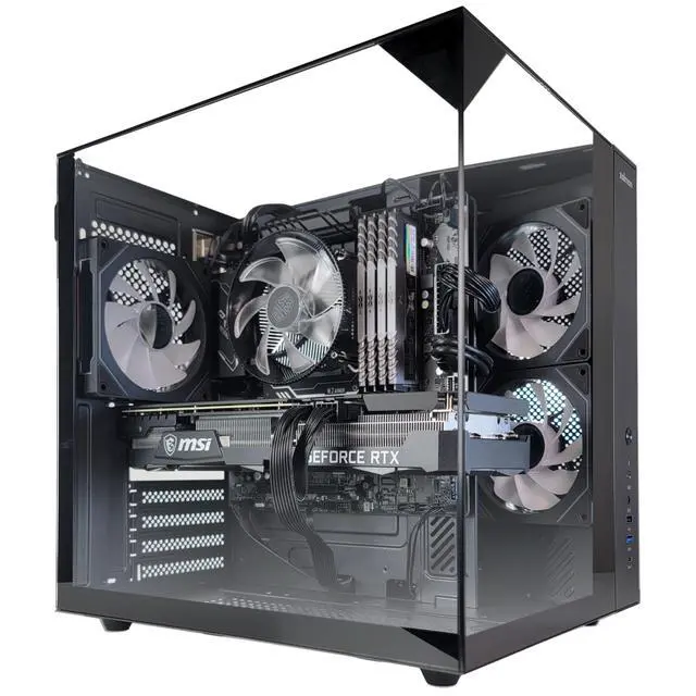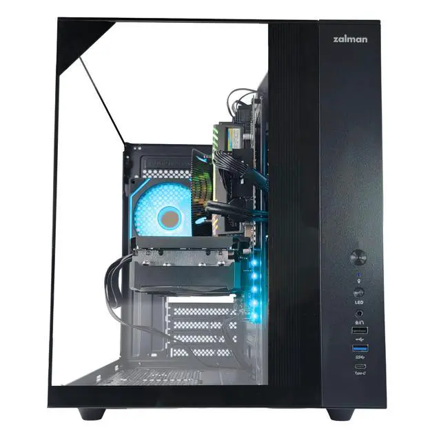 • Shell: Zalman ZQBE Black : The Zalman ZQBE Black ATX mid-tower delivers a bold panoramic showcase with three tool-free tempered glass panels, providing a full 270° view of your components and ARGB lighting. Built with steel, plastic, and tempered glass, this compact yet powerful chassis is optimized for airflow with angled side ventilation, a perforated bottom panel, and three pre-installed high-performance PWM ARGB fans. Designed for easy building and clean cable management, the fully removable panels offer effortless access during installation and upgrades. The ZQBE Black is ideal for gaming, creator, and high-performance builds. Powered by a Cooler Master or equivalent CPU cooler. Front I/O includes USB Type-C, USB 3.0, USB 2.0, HD audio, and dedicated RGB control. Case dimensions: 339(D) x 268(W) x 340(H) mm.