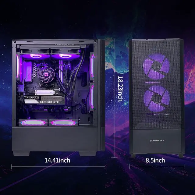 The ALCPOK gaming desktop is designed specifically for gamers. It is equipped with an AMD Ryzen 5 9600X processor with a base frequency of 3.9GHz(5.4GHz Turbo), ensuring fast response times and smooth multitasking. It also features an NVIDIA RTX 5060ti 16GB graphics card for stunning visuals. With 32GB of DDR5 6000 memory, you can enjoy all the latest games without worrying about performance bottlenecks. It features a 1TB NVMe SSD, providing ample storage space and fast loading speeds. The ARGB liquid cooling system and remotely controllable RGB lighting combine efficient cooling with a stylish appearance.