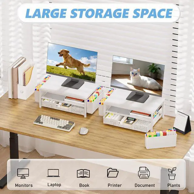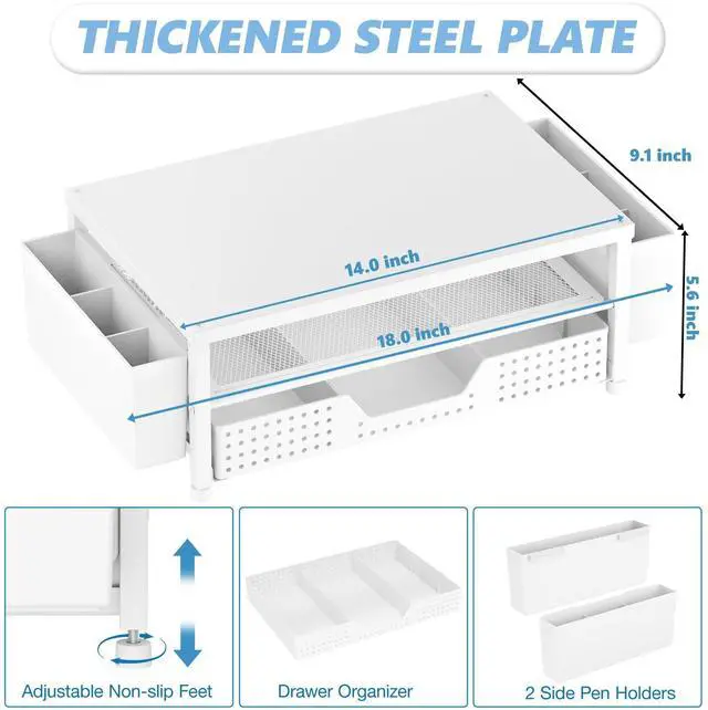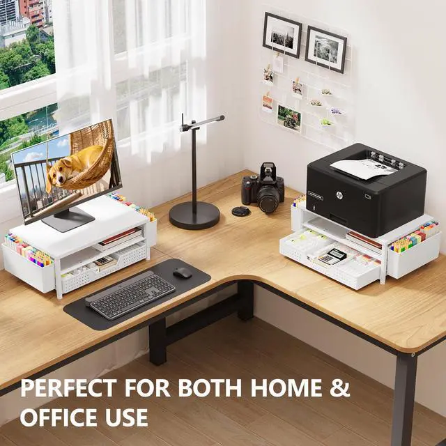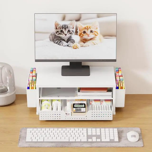 OPNICE monitor stand with drawer and 2 pen holders helps keep your desk organized and creates a calm workspace where you can think more clearly, focus and work more efficiently.