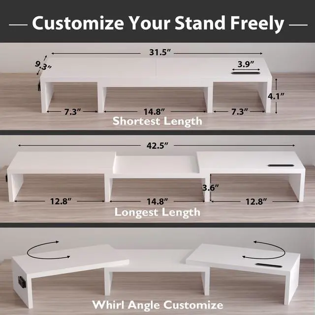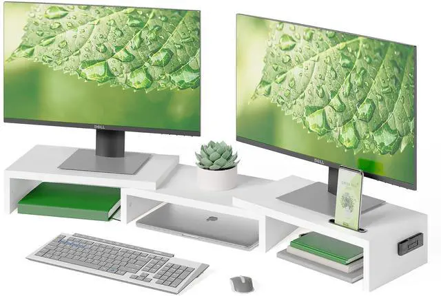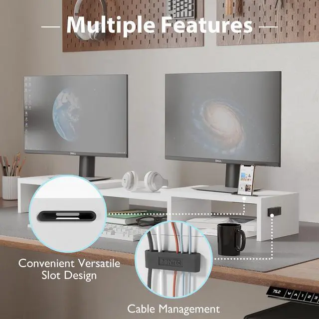 The Dual Monitor Riser measures 43 x 9.3 x 4.1 inch (L*W*H) and can be used as a computer stand, laptop riser, printer stand, PC tower stand, or even a desk organizer. And there are also slots for phones, iPad, and stationery on the desktop.