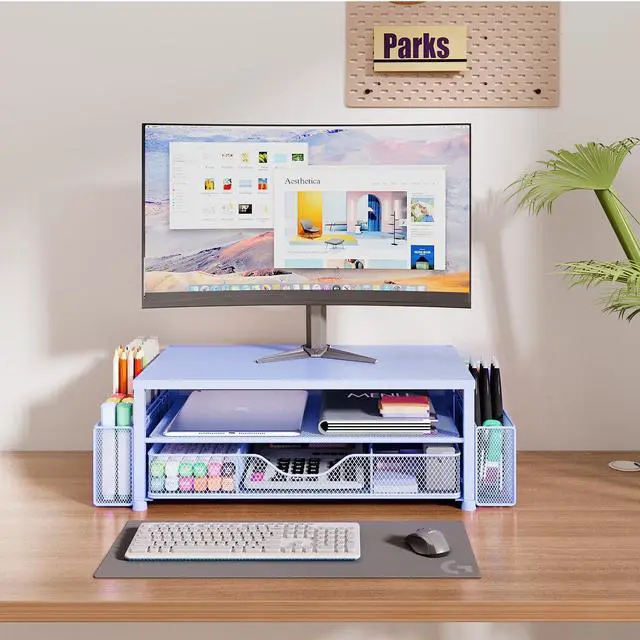 Desk Organizers and Accessories, 2-Tier Computer Monitor Stand Riser with Drawer and 2 Pen Holders, Laptop Stand, Office Desk Accessories for Office Supplies, Blue