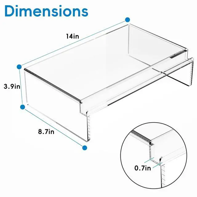 Declutter your desk and elevate your workflow with the Crpich Acrylic Monitor Stand. Designed with both form and function in mind, this transparent monitor riser features a full-length front groove primarily made to store your keyboard when not in use keeping your workspace neat and easy to clean. The thoughtful design helps eliminate clutter without creating hard-to-reach dust traps, making desk maintenance effortless. Crafted from thick, premium-grade acrylic, it offers exceptional durability and a crystal-clear finish that complements any setup. Smoothly polished edges add a touch of elegance while ensuring safety during everyday use. More than just a monitor stand, this multifunctional piece can also accommodate phones, pens, sticky notes, and other small accessories in the same groove giving everything a proper place. Whether you're working from home, studying for exams, or optimizing your creative space, the Acrylic Monitor Stand is the minimalist upgrade your desk deserves.