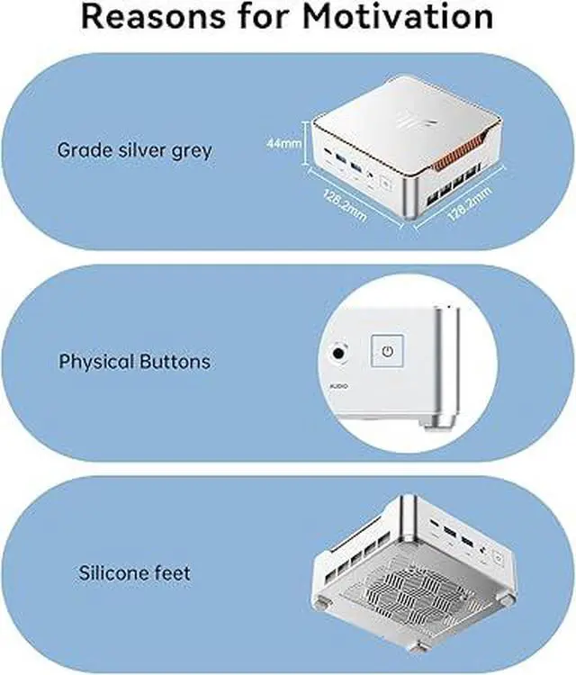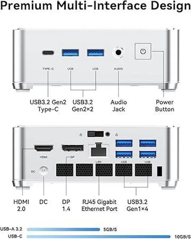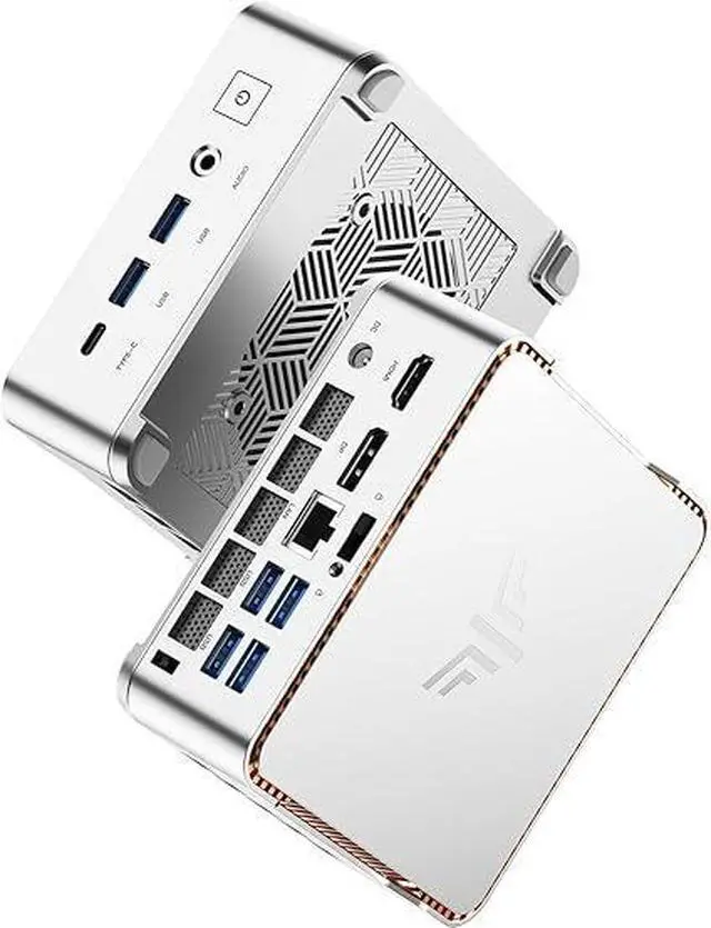 FIND MORE BONUS ON H2The mini pc case is made of silver-white metal with orange lines on the edges, enhancing the sense of grade of the product. The mini computer is designed with 6 USB 3.2 ports, and the direct benefit of multiple USB interfaces is that it "does not need to be plugged and unplugged frequently", allowing keyboard and mouse kits, external hard drives, USB flash drives, printers, cameras, gamepads, mobile phone charging cables and other devices to stay connected at the same time and stand by at any time. The H2 mini gaming pc head unit is also equipped with 1 Type-C port, 1 HDMI port, 1 DP port, 1 RJ45 Gigabit Ethernet port, 1 audio input/output port, and 1 DC power port.