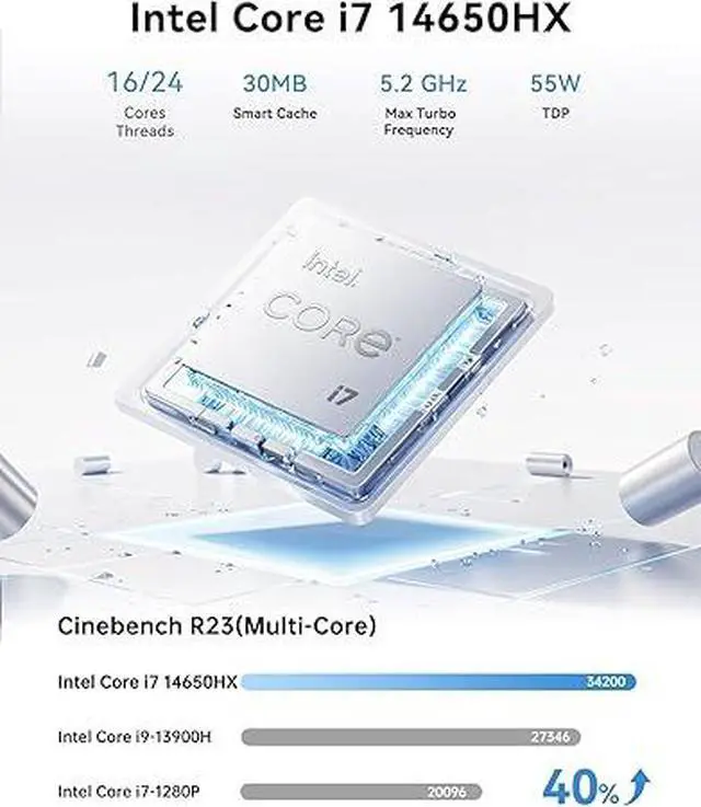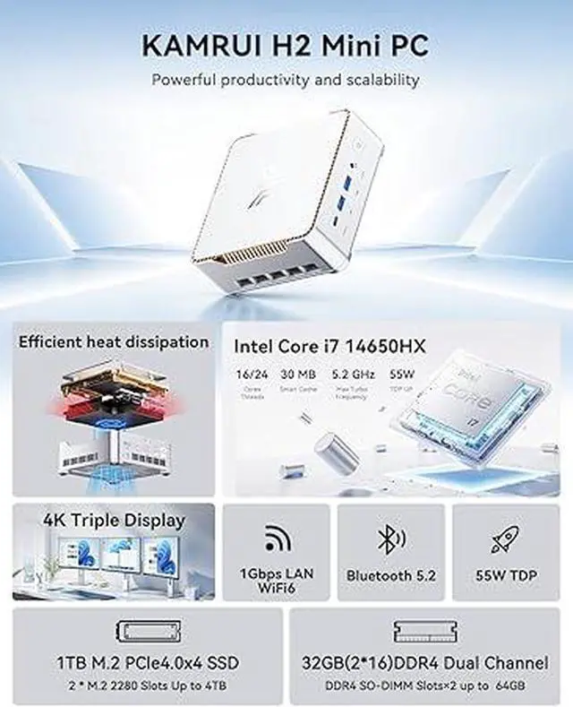 KAMRUI H2 GAME LITTLE STEEL CANNON - IN·TEL CORE i7-14650HXThe KAMRUI mini gaming pc W-11 pro is equipped with an 14th Gen In·tel Core i7-14650HX flagship mobile processor with a turbo frequency of up to 5.2 GHz and a 30MB L3, 16-core 24-thread design. The mini mini desktop computer delivers 70%-100% faster multi-core performance (16 cores vs. 8 cores) in large 3A games or multitasking scenarios such as complex 3D rendering and video editing. It delivers desktop-level performance and handles a wide range of high-load challenges with ease.