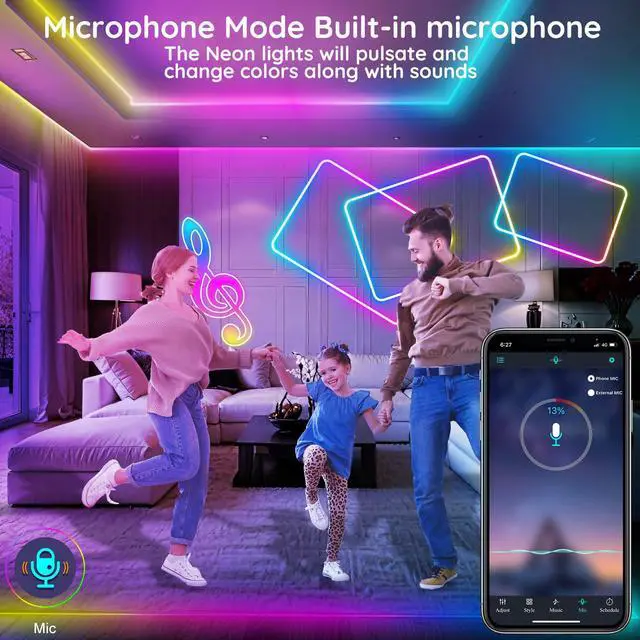 Transform your space into a vibrant, dynamic atmosphere with the 20FT Neon Rope Lights, now featuring Mic Mode. With the built-in microphone, these lights pulse and change colors in response to sound, adding an exciting, interactive dimension to your lighting experience. Whether you’re hosting a party, enjoying your favorite music, or simply enhancing your home decor, these sound-activated lights will sync seamlessly with the surrounding sounds, creating a mesmerizing visual display that moves with the rhythm of the sound around them.