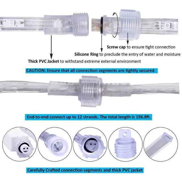 EASY INSTALLATION AND CONNECTION: Coaxial connector can connect up to 12 sets of the same model rope lights. First, please carefully roll out the rope, hang or hook it any space you heart desired. Plug in and enjoy the lights.