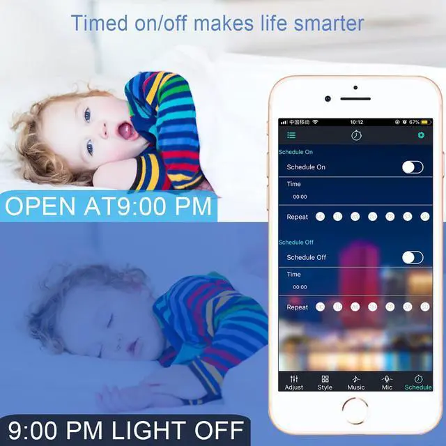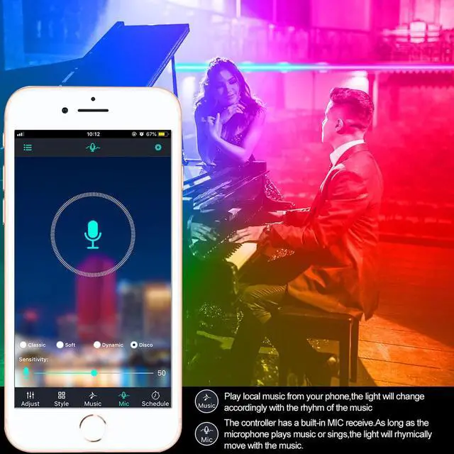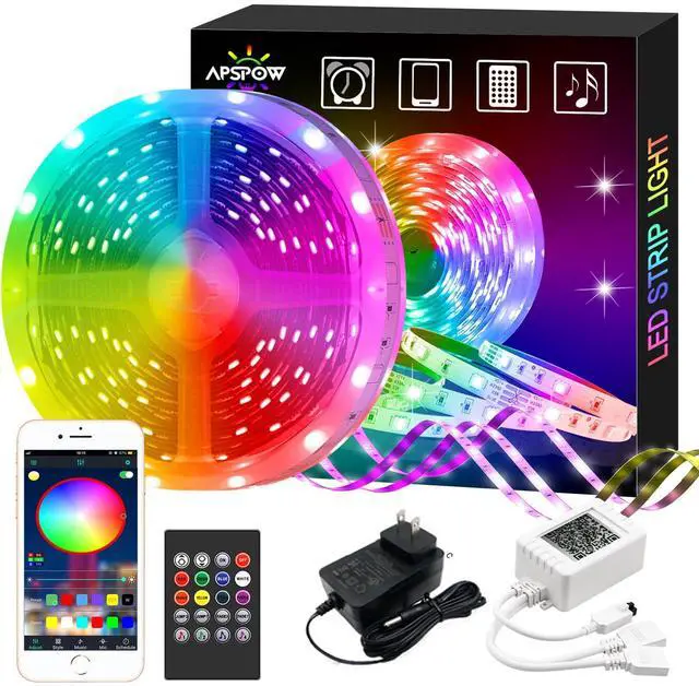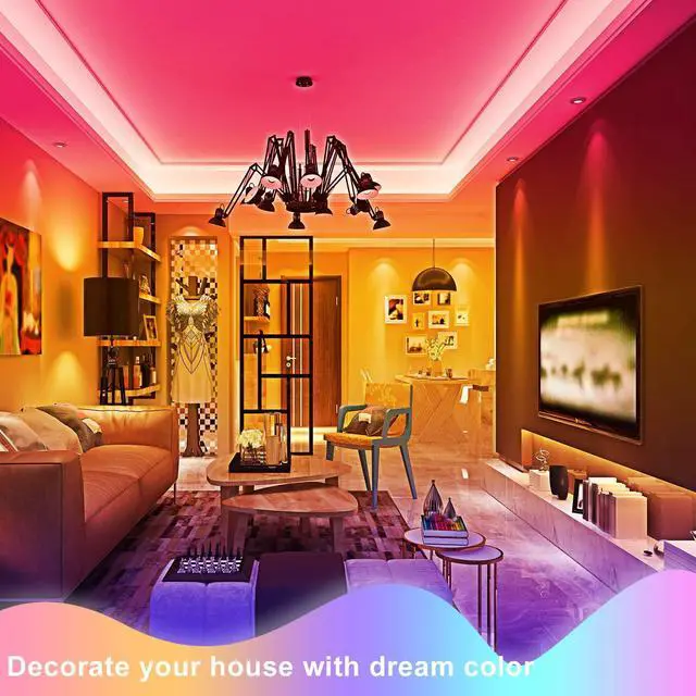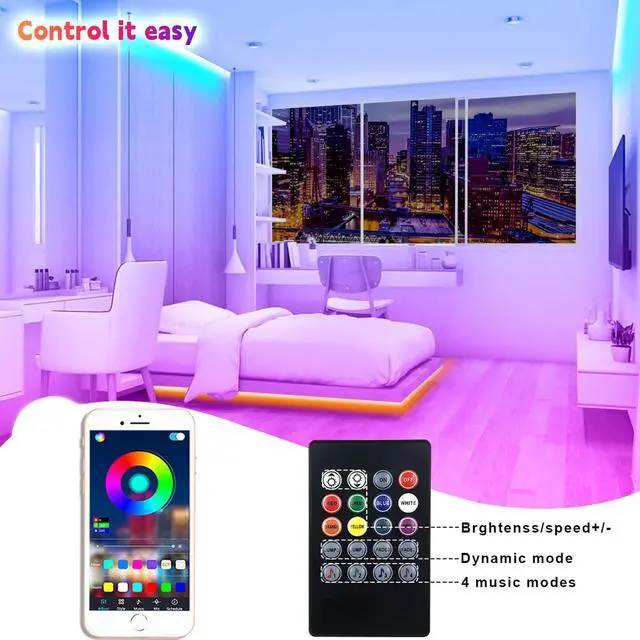 Multiple controls: The LED strips are designed with multiple control modes: Bluetooth app + IR remote control + MIC + MUSIC + 3 button switch. There are 16 million colors to choose from, as well as a variety of automatic modes, music functions, microphone functions, alarm clock functions, etc.,