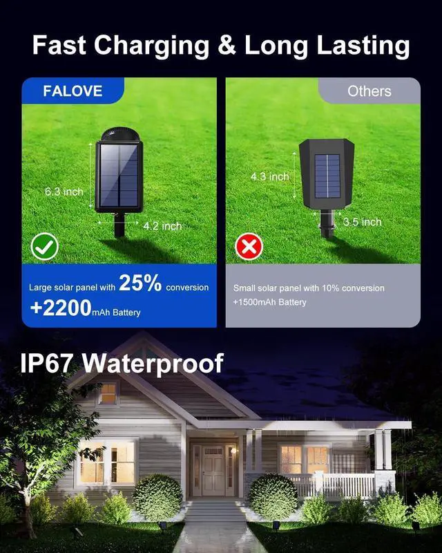 Professional Landscape Spotlights: Our solar spotlights boast an IP67 waterproof rating, FALOVE' s latest solar spotlights can store more power in the same weather conditions, providing longer-lasting and more stable illumination with a longer lifespan.