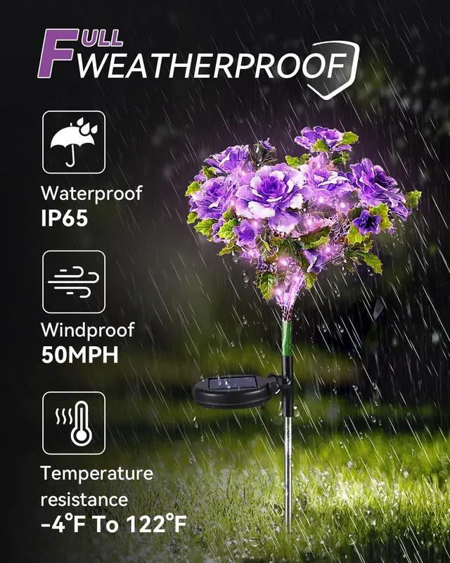 3. Neporal solar flower lights outdoor garden waterproof are IP65 waterproof, weather-resistant - perfect for all year round use. With aluminum alloy stake, Neporal solar garden stakes can be firmly secured to the ground, preventing breakage or loss in windy weather. Neporal solar flowers outdoor waterproof add a splash of color and charm to any outdoor decor, garden decor, yard decor, patio decor as well flower bed, front porch, backyard, pool, plant pot, or balcony