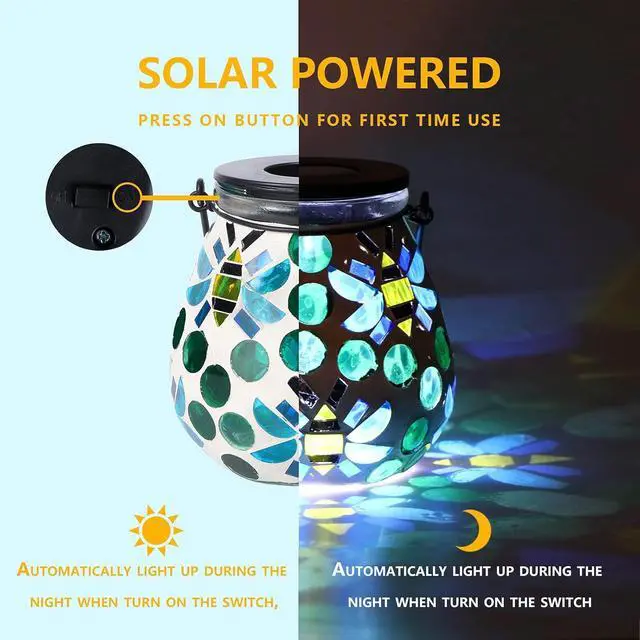 SOLAR POWERED- The mosaic solar lanterns charge for about 5-8H under sunlight, and auto light up and shine for 8-12h when its dark. Please remember to push the switch to the " ON" position before using and charging