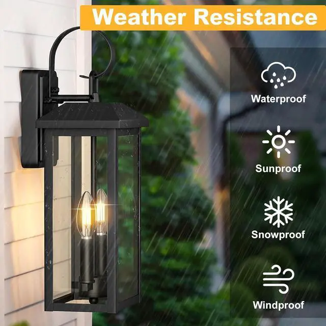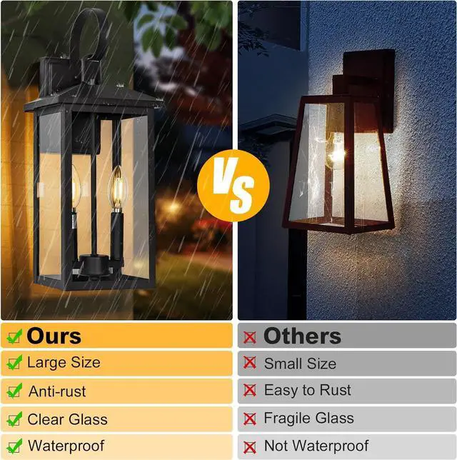 Unique 2-light wall sconce: Our large outdoor wall sconce is a modern design with 2-head and 2-light. The integrated design of the lamp pole and top enhances the stability of the lamp pole., the clear lamp shade can showcase your bulb of choice to create a stunning light outside your home. The black outdoor front light fixture adding a touch of sophistication to its surroundings