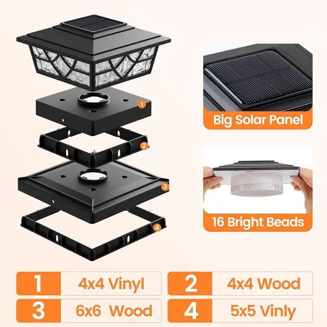 Universal Post Compatibility: Designed to fit 4x4 and 6x6 wooden posts, as well as 4x4 and 5x5 vinyl posts. APONUO solar fence post lights come with adapters for a snug, secure fit on multiple post sizes