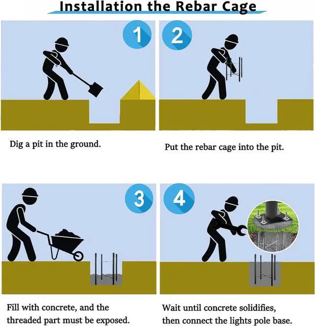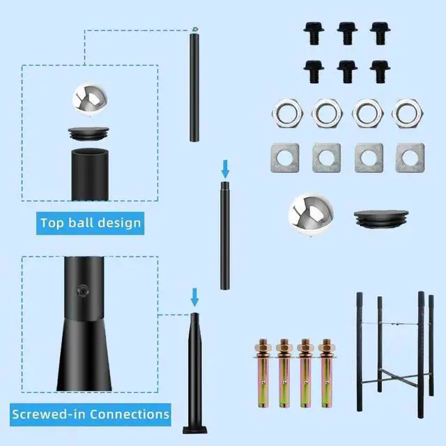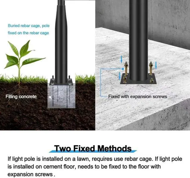 Easy to Install - Assemble each section pole with screw, there are two ways to fix the bottom pole, using a rebar cage to fix it on lawn, or using expansion screws to fix it on cement floor