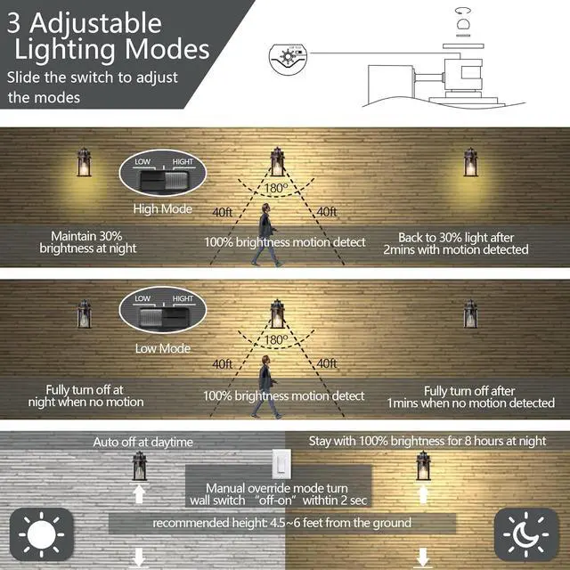 Widely Detected Range: The outdoor wall sconce with motion sensor can be sensing a distance of up to 40FT and a detection angle of up to 180°than the general motion sensor light. Which better performance, please install the wall lantern with outlet at least 5 feet from the ground.