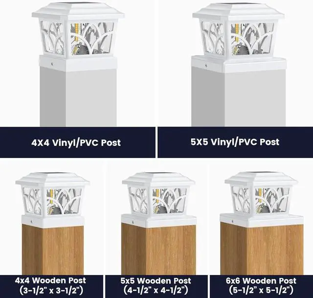 [Vinyl & Wooden Posts] These deck post lights are versatile and can be easily installed on both 4x4 and 5x5 vinyl posts, as well as 4x4, 5x5, and 6x6 wooden or metal posts. They are perfect for placement on mailboxes, fences, patios, porches, columns, or docks.