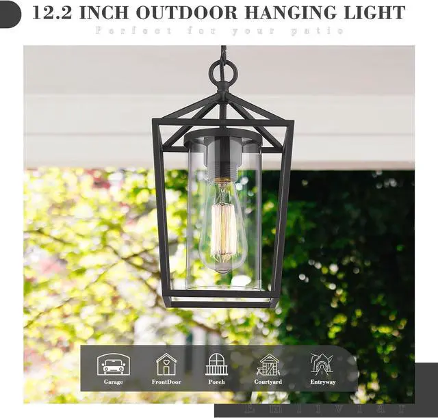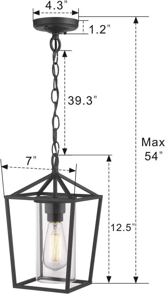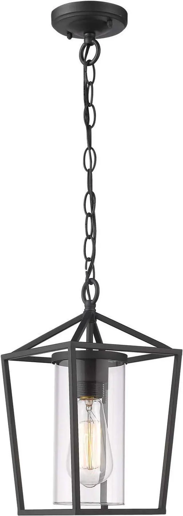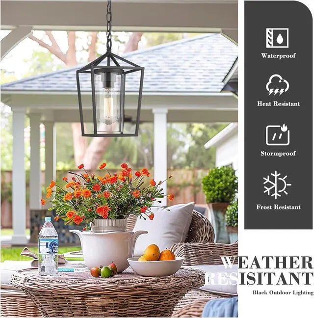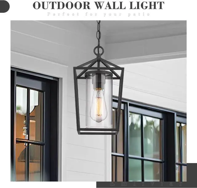Weather resistant and suitable for wet locations, this outdoor hanging light features sturdy metal construction and clear glass in black finish