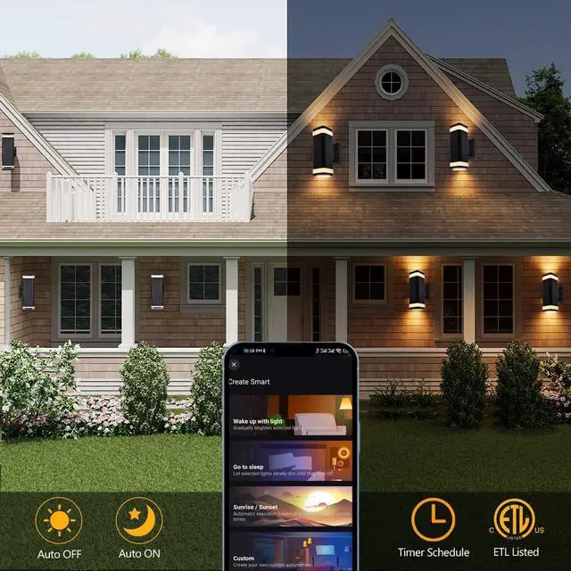 Modern Double Artistic Lighting: This outside wall lights features a sleek modern square design, these smart wall sconces provide up and down lighting that expands the illuminated area and adds a stylish touch to your outdoor decor. Adjust the brightness from 0% to 100% and fine-tune the colors to suit your preferences, whether for security, ambiance, or decorating for special events.