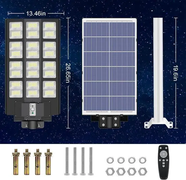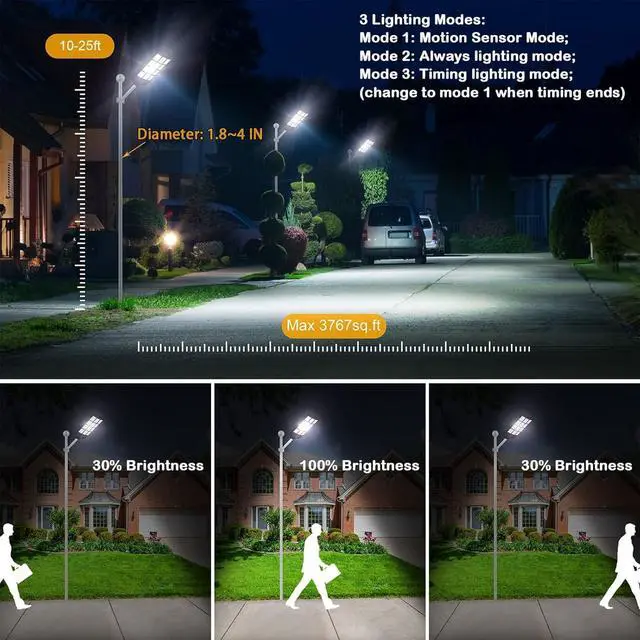 [Easy to Install] The solar street light has 2 ways to install, with solar light arm bracket. LED solar street lights easy to install, screw fixing, dependable operation without the need for wiring or trench. You can install solar lights on walls, trees, light poles, etc. where you want to install (support street light post diameter: 1.5 to 4 inches, suggest height 10-26 ft)
