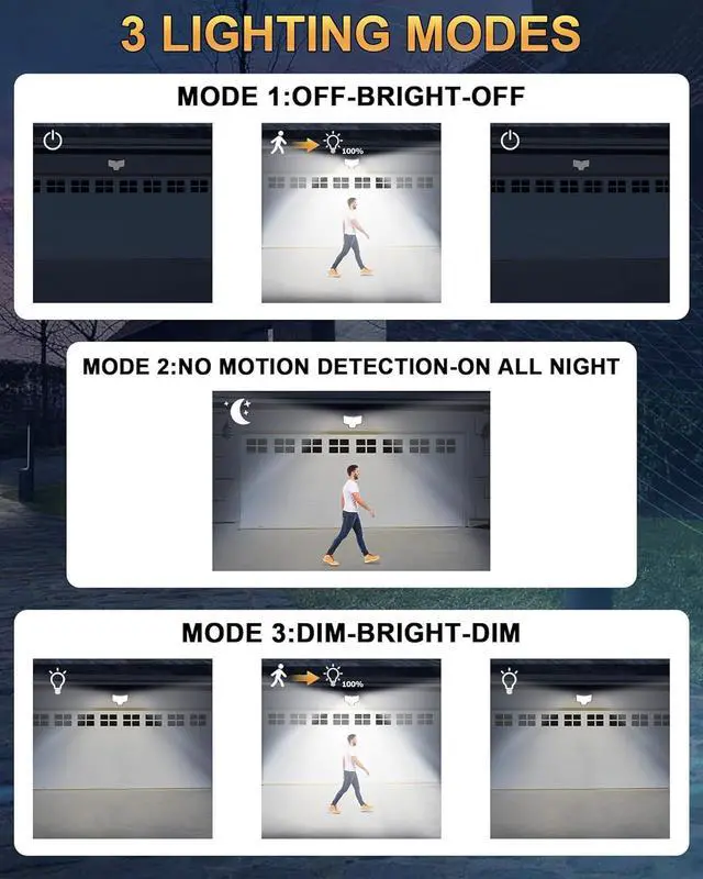 Mode 3: The solar motion light stays on at night with low brightness, when motion is detected, it becomes bright and returns to low light after 30 seconds